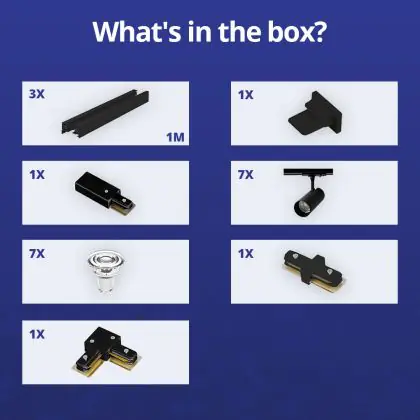 Description Ensemble complet Rail Monophasé Rail L 1 x 2 Mètre Noir | incl. 7x Spot + GU10 2700K 3W Dimmable + Embout, Connecteur d’Alimentation et L -Connecteur